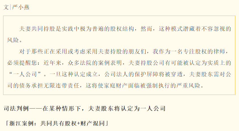 夫妻共同持股是实践中极为普遍的股权结构,然而,这种模式潜藏着不容忽视的风险。 对于那些正在采用或考虑采用夫妻持股的朋友们,我作为一名专注股权的律师,必须提醒您:近年来,众多法院的案例表明,夫妻持股公司有可能被认定为实质上的“一 人公司”。一旦这种认定成立,公司法人的保护屏障将被穿透,夫妻股东需对公司的债务承担无限连带责任,这将使家庭财产面临被强制执行的严重风险。