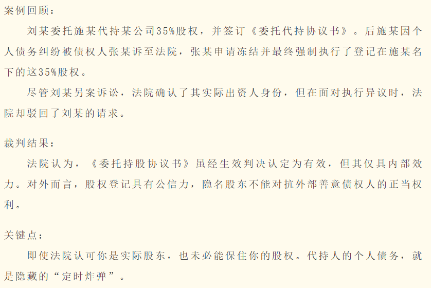 很多人认为,只要签了代持协议,股权就永远归属于自己。然而在法律的视野里,登记才是权利王道。一旦代持人自身出现负债、婚变等风险,你所依赖的“代持协议”很可能无法对抗外界的善意第三人,多年心血可能瞬间易主。