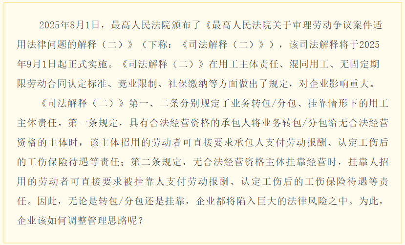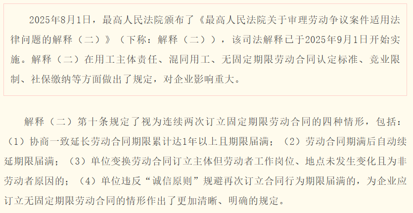 2025年8月1日,最高人民法院颁布了《最高人民法院关于审理劳动争议案件适用法律问题的解释(二)》(下称:解释(二)),该司法解释已于2025年9月1日开始实施。解释(二)在用工主体责任、混同用工、无固定期限劳动合同认定标准、竞业限制、社保缴纳等方面做出了规定,对企业影响重大。