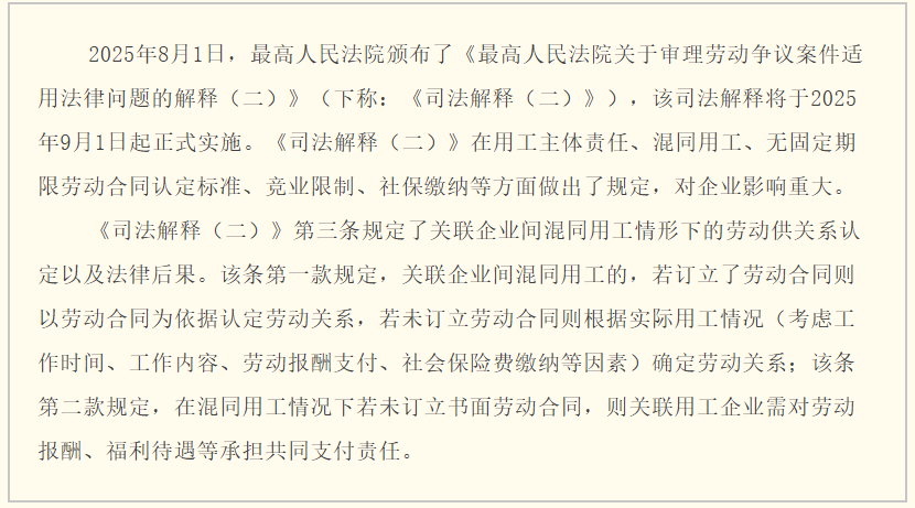 2025年8月1日,最高人民法院颁布了《最高人民法院关于审理劳动争议案件适用法律问题的解释(二)》(下称:《司法解释(二)》),该司法解释将于2025年9月1日起正式实施。《司法解释(二)》在用工主体责任、混同用工、无固定期限劳动合同认定标准、竞业限制、社保缴纳等方面做出了规定,对企业影响重大。