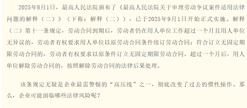核心提示:劳动合同到期后,如果员工还在正常上班,企业也没有异议,双方“默许”继续用工,将不再安全。最高法新规已为这种情况画上“休止符”,企业合规管理刻不容缓。