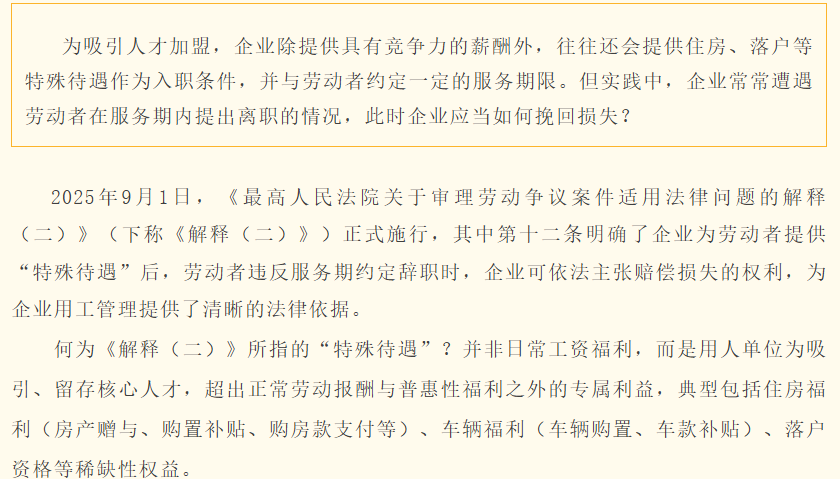 为吸引人才加盟,企业除提供具有竞争力的薪酬外,往往还会提供住房、落户等特殊待遇作为入职条件,并与劳动者约定一定的服务期限。但实践中,企业常常遭遇劳动者在服务期内提出离职的情况,此时企业应当如何挽回损失?
