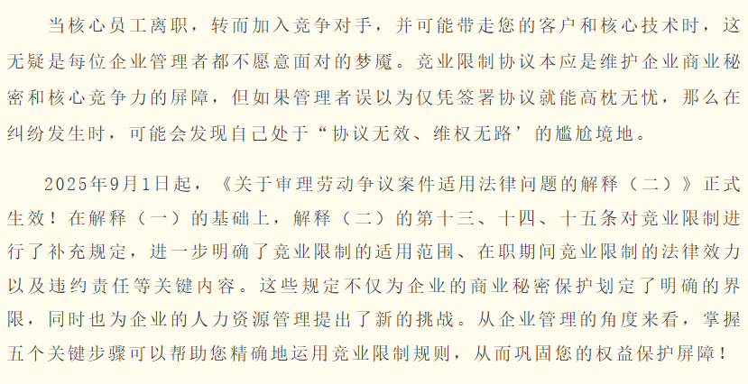 当核心员工离职,转而加入竞争对手,并可能带走您的客户和核心技术时,这无疑是每位企业管理者都不愿意面对的梦魇。竞业限制协议本应是维护企业商业秘密和核心竞争力的屏障,但如果管理者误以为仅凭签署协议就能高枕无忧,那么在纠纷发生时,可能会发现自己处于“协议无效、维权无路’的尴尬境地。
