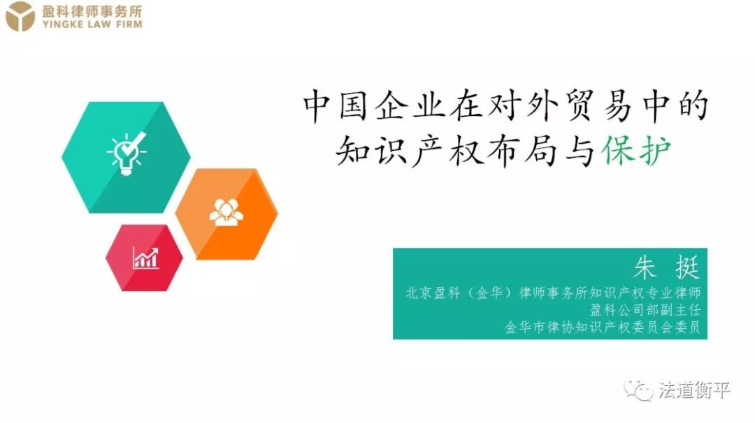法道衡平团队朱挺律师在本次研讨会上发表《中企在对外贸易中的海外知识产权布局和保护》的主题演讲。在演讲开始时,朱律师从当下热点问题出发,结合中美贸易战知识产权问题、骑客平衡车专利问题、国际足联2018年世界杯在我国的知识产权布局和保护问题,从实战的角度向参会企业分析了企业海外知识产权布局和保护的重要性。
