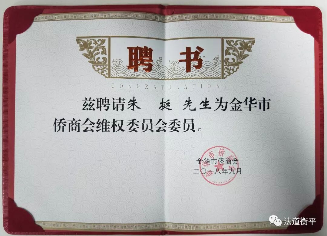 (金华市侨商会监事长、法国金华商会会长张磊为朱挺律师颁发聘书)