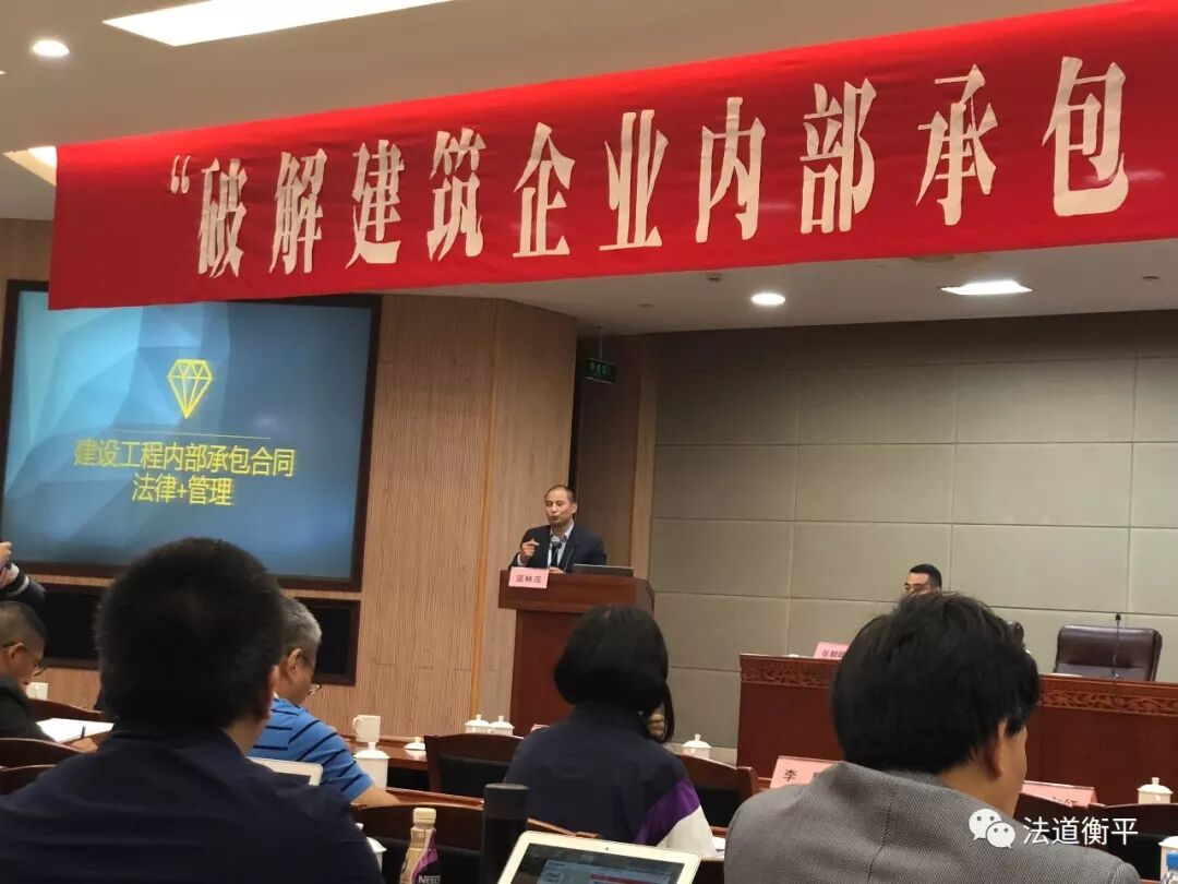 2018年10月20日,由浙江省律协主办,金华市律协、省律协建设工程专委会承办,金华市建筑业行业协会法务委员会、盈科金华分所协办的“破解建筑企业内部承包责任制的法律风险”研讨会,在金华市文化中心201会议室举行。法道衡平律师团队负责人蓝林茂律师应邀为本次研讨会分享“建设工程内部承包合同法律+管理”。